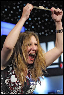 Est-ce d’avoir trop crié lors de cette magnifique cérémonie du mois de juin 2010? J’ai écouté Vanessa commenter un tournoi amateur l’autre soir sur une Poker radio, et je dois dire, compte tenu du nombre impressionnant d’auditeurs ayant posé des questions à Vanessa sur le chat, que je n’ai pas été le seul homme séduit par cette voix mélodieuse, légèrement basse, par ce ton mi-sérieux, mi-railleur, par ces pointes d’humour suivies de quelques rires discrets mais communicatifs. Une femme de 38 ans, qui sait de quoi elle parle. Une jeune mère de famille mais plus une enfant. Une femme qui a eu plusieurs passions : un métier prenant : la Pub. Graphiste et designer. La musique. Pianiste Jazzy et Classique. Le Poker. Nous ajouterons qu’une parure-bracelet au poignet, cela embellit. Et qu’il va à Madame comme un gant ! Le tour est joué (WSOP 2010).