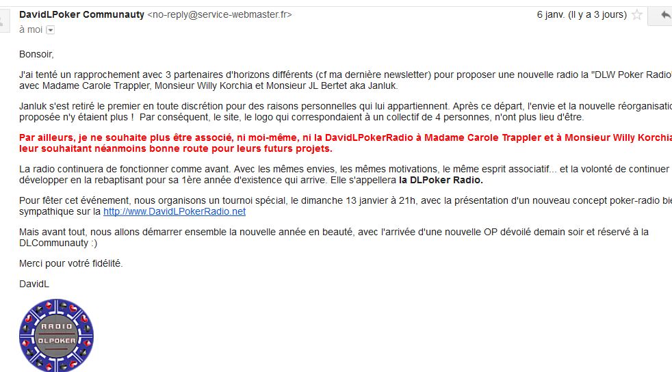 PS. Quant à la radio, nos deux ex associés Carole Trappler et David sont témoins du fait que je t’ai laissé les mains libres depuis un mois. Ce n’est pas moi qui t’ai éjecté. Et tu n’en es pas sorti pour les fallacieuses raisons que tu invoques!