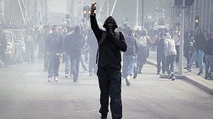 High school students clash with anti riot police during a demonstration on October 15 2010 in Lyon to protest against France’s government pensions reform. France’s main unions upped the ante in the fight against the reform meanwhile, calling for their members and supporters to hold the fifth in a series of strikes and street rallies on October 19. AFP PHOTO / JEAN-PHILIPPE KSIAZEK