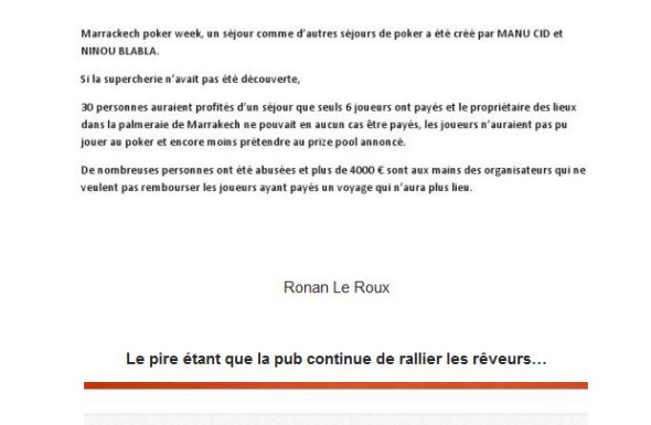 Le 3 avril, malgré des échanges de preuves entre Ray (patron de French poker radio) et Ronan Leroux, prouvant sa bonne foi et offrant à Ray de reconnaître son erreur et qu’il avait été aussi berné, ce dernier s’obstine et republie un article. « Ils partent, n’en déplaise aux autres. » Na !