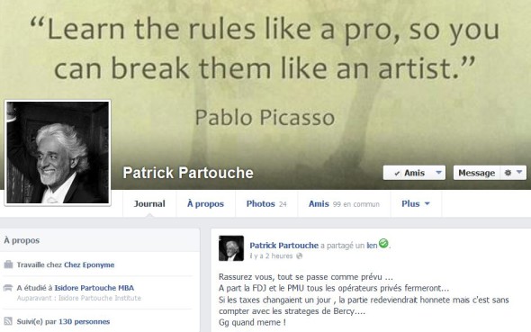 Warning. Nous ne faisons ni l’apologie de M. Marc Simoncini ni le procès de Monsieur Patrick Partouche. Encore moins de comparaison. Il n’y en a pas. Nous entrevoyons simplement la possibilité que la solution du re-développement du poker en France, passe par des gens qui sont des grands communicants du Net et des novateurs. Surement pas via des petites phrases acerbes ou revanchardes, d’ex patrons de room via les réseaux sociaux. Pas par des joueurs ou des patrons de sites en ligne ringards. Moi y compris, cela vous évitera de le penser. Les procédés de réclame classique ont vécu. Place à l’imaginaire et à la passion. De plus, nous désirons simplement et de la façon la plus neutre possible, que soit traduit en bon français de tous les jours (pas du dimanche), ce que chaque responsable (de room, casino, ou ministères…) veut dire lorsqu’il s’exprime avec des effets de manches, ou à travers des articles de presse orientés ou encore par le biais de messages tronqués ou fallacieux.