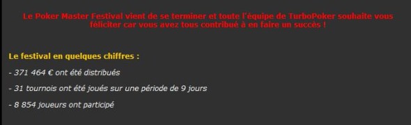 Alors oui, nous le redisons de plus belle : dans une room moyenne, les clients sont plus grands ! Sont gagnants ! Et imaginez si 3 rooms s’entendaient pour multiplier les lots par 4 ou 5 ? Ce ne sera plus 370 K€ qui seront distribués sur 9 jours par TurboPoker (voir capture di-dessous) ! Ce serait 1.5 Million d’euros sur les rooms IPoker unifiées ! Et cela referait bouger tout le monde, à commencer par la concurrence : et ce, dans le bons sens ! les joueurs, les rooms et l’État ! Et les erreurs commises par les 3 entités pré-citées ne devraient pas être renouvelées une seconde fois. Cela fait un an que j’en parle avec mon ami (et néanmoins fiscaliste) F. Debeauvais. Ce n’est pas de la fiction, c’est du simple bon sens. Quiconque réfléchit par lui-même arrivera à ce même genre de solutions, voire conclusion. Parce qu’être blogueur, c’est aussi réfléchir un petit peu ; pas toujours traduire des réflexions mille fois ressassées, rabâchées, radotées, serinées et rapportées des US… 😉