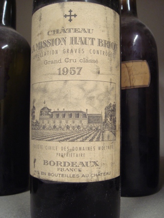 15 mai 69, j’ai 15 ans. C’est en semaine, je m’en souviens, mais ce soir-là, le diner revêt un caractère un peu officiel. Je passerai sur les détails, mais après diner, mon père doit prononcer un discours, après lequel nos 2 hôtes bretons (MM Poher et Pleven)* poseront la touche finale à une campagne présidentielle qui verra l’élection du cacique Pompidou. Toujours est-il qu’à la fin du repas, j’ai eu le droit de goûter ce nectar, ce Mission Haut Brion d’un millésime pourtant pauvre (1958 et non 57 comme sur la photo). Une demi tulipe au fromage… Découverte, délectation, révélation ? A partir de ce jour et aussi souvent que possible, j’accompagnai mon père à l’Elysée ou au Sénat, à l’occasion de déjeuners ou de diners simples. Uniquement pour y goûter un fond de vin et récupérer les menus dorés à l’or fin !