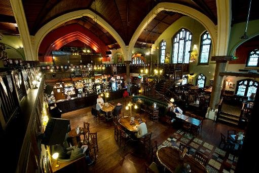 A peine franchi le porche de l’église presbytérienne de Muswell Hill, un très ancien lieu de culte de briques rouges dans le nord de Londres, un énorme tonneau en bois de Guinness rappelle aux visiteurs que le seul bénitier qu’ils trouveront ici, c’est une solide chope… et que la boisson qui la remplira sera de couleur brune, ambrée ou blonde ! Le transept est resté quasi identique, surmonté de ses arches de style gothique, mais revues couleur locale (brique rouge) donc repeintes en rouge vif. Un bar gigantesque s’y trouve abrité et les bancs d’église ont été remplacés par un mobilier très adapté au nouvel objet social…