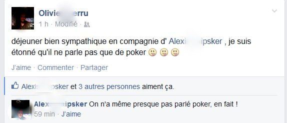 Dans le poker, il y a une hiérarchisation du m’as-tu-vuïsme. Cette hiérarchie est implicitement reconnue. C’est une revalorisation de son égo. Tout le monde est content. Celui qui met sur son mur qu’il a déjeuné avec Untel est le moins fort. Untel, qui vient mettre un like désinvolte, consent donc à dire, en jargon poker-social, « oui, c’est vrai, j’y étais ». Si Untel met en plus un petit commentaire, cela veut dire en général « c’était pas mal » ou peut vouloir encore signifier « j’étais invité ».