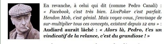 djenChacun connait Live Poker. La présence physique du rédacteur en chef a certes un peu diminué avec le temps, mais la relève est omniprésente dans les casinos où se pratique encore le poker.  Et comme disait Janluk, tout en préservant leurs intérêts, il « essaie » néanmoins de conserver une certaine indépendance éditoriale… ce qui les honore. A noter la récente présence de Djen sur RMC. Un discours intéressant même s’il n’a cessé d’être interrompu 😉 !