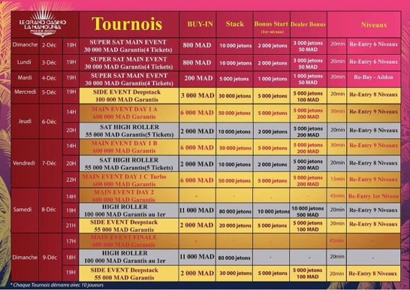 Une très belle semaine à Marrakech ! Que dire de plus que mon ami Bruno BrdukeBig Roger avait réservé aux 50 premiers inscrits un package promotionnel à 800€ au lieu de 1100€, comprenant la participation au Main Event à 550€, un Side Event à 270€, et 5 nuits d’hôtel petits déjeuners inclus, du 4 au 9 décembre.