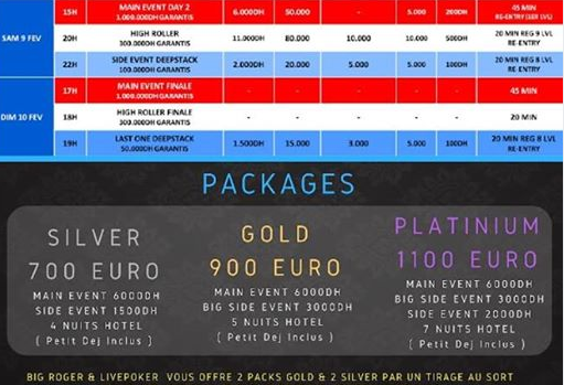 Pour ma reprise de Table rase, j’ai offert trois packages Silver au blog et à Janluk, pour une valeur totale de 2100 euros. Le petit jeu concours a désigné Guelena Guelena, Guilhem Sant et Florian Pokpok. Guilhem a de suite prévenu de son problème pour se libérer à ces dates-là. Merci à lui. Nous avons proposé d’offrir ce lot à la quatrième de notre concours, Sylvie Candy 78. Ne manquez surtout pas la reprise des Championnats du Maroc de Poker. C’est tout droit ! Roger Hairabedian.