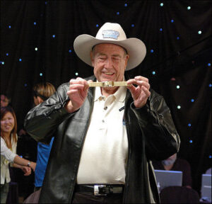 Top Modèle : Doyle Brunson. S’il n’y avait pas les TV poker américaines, avec les Phil Ivey, Phil Hellmuth, D. Negreanu et autres D. Benyamine, à l’Aria ou ailleurs, personne en France, n’en aurait entendu parler, tant ce champion est déjà âgé et sait se faire discret. Comme son fils du reste. 10 bracelets, ses amis Hellmuth et Negreanu ou encore Phil Ivey en ont des dizaines… Et d’aucuns reprennent pour Doyle le dicton suivant : « Que sans la variance et la chance, il serait le meilleur joueur du monde 😉 «